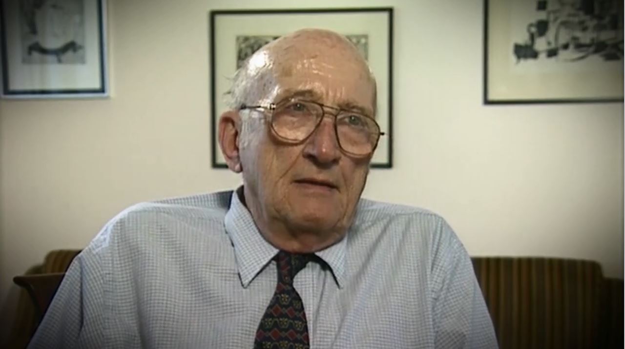 Cut to Holocaust survivor Gerhart Maass, sitting in front of a wall with three paintings, and looking to the right of the camera. The camera shows his face and shoulders as he speaks during an interview conducted in Montreal in 1998.