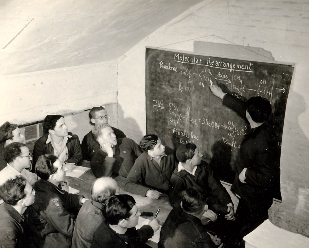Jack Hahn, pictured at the table, second from the bottom left, at a study session on molecular rearrangement. Study groups in internment camps were led by tutors – themselves refugees – who were former teachers or professors. Camp I (Île-aux-Noix, Quebec), ca. 1940. (Jack Hahn Family Collection)