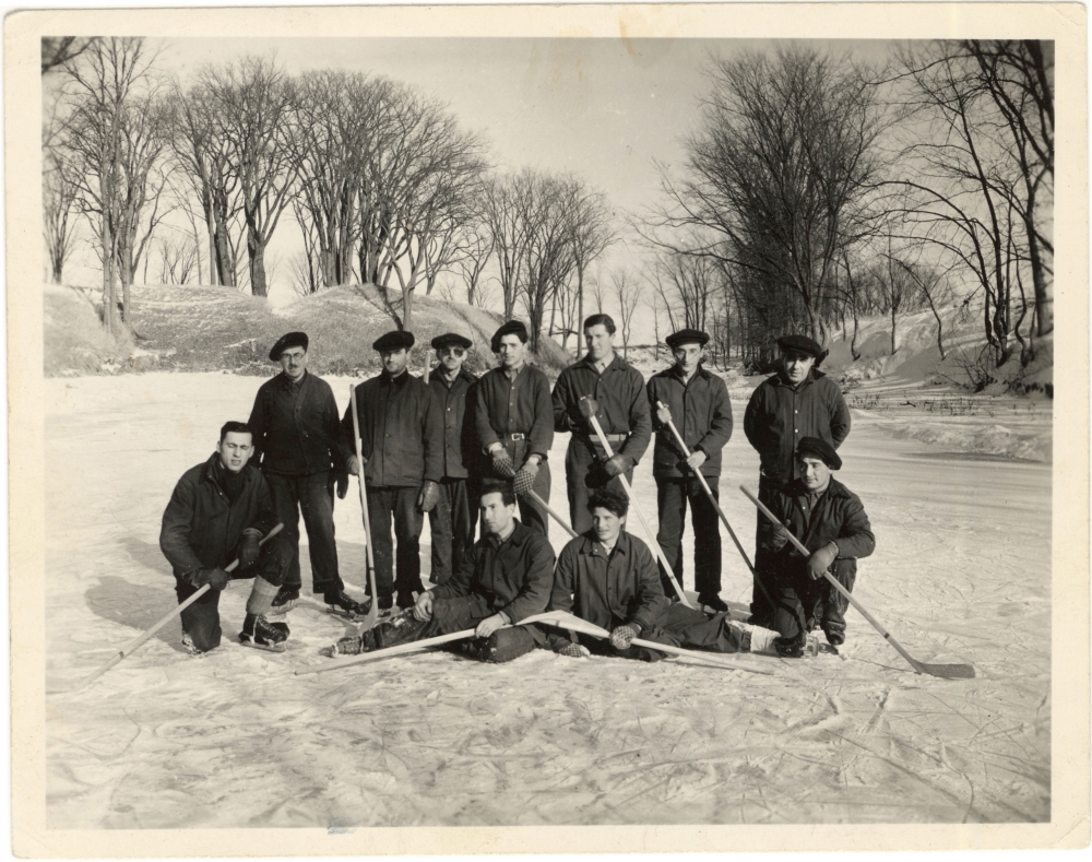 Jack Hahn, assis sur la glace. le deuxième à partir de la gauche dans la première rangée, a joué dans l'équipe de hockey « Kosher Section » pendant qu'il était interné au Camp I, Fort Lennox à l'Île-aux-Noix, Québec, 1941. Il a joué au sein de la même équipe que Joseph Lazar. (Collection de la famille de Jack Hahn)